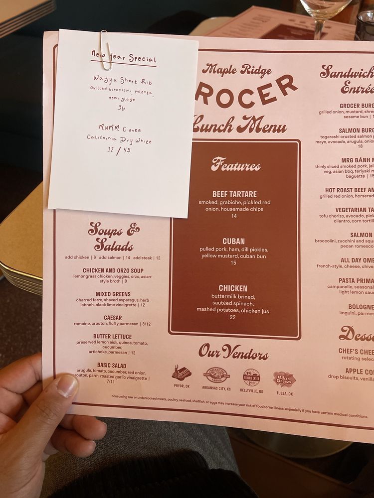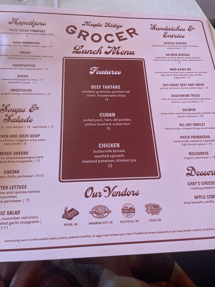 Maple Ridge Grocer offers a delightful breakfast and brunch experience with a variety of sandwiches and an impressive beer bar selection. The restaurant features outdoor seating, a casual yet upscale vibe, and a moderate noise level. Located in Tulsa, Oklahoma, Maple Ridge Grocer provides a unique dining atmosphere for customers to enjoy. Menu highlights include appetizers like Baba Ghanoush and Maple Roasted Carrots, a selection of white wines, and a diverse beer list. Customers have praised the excellent service, calming aesthetic, and delicious dishes like the Salmon Sandwich and Chicken Orzo Soup. The ambiance of the restaurant, reminiscent of a 1960s experience, adds to the overall dining experience. With attentive wait staff and tasty food offerings, Maple Ridge Grocer is a must-visit spot for a memorable meal.
